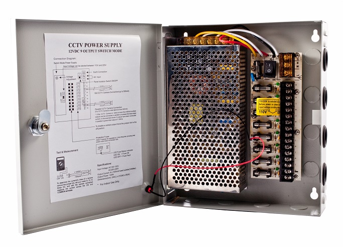 3. В металлических щитках. Данный вид блоков питания устанавливается стационарно и представлен металлическим ящиком с закрывающейся дверью. Такие корпусы отличаются максимальной надежностью. В них также можно установить аккумуляторную батарею. Стационарные системы видеонаблюдения лучше всего использовать именно в металлических щитках, чтобы обеспечить должный уровень защиты и надежности.