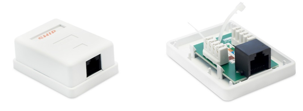 Для внешнего монтажа. Корпус настенной розетки состоит из основания и крышки. Конструкция выполнена из высококачественного пластика. Внутри расположен модуль RJ-45, UTP, стандарта категории 5e. Крепёжные элементы для монтажа включены в комплект. Корпус крепится к поверхности при помощи двух винтов и шурупов.